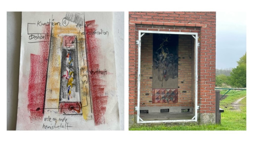 Kunsttårn 4 stands on Korsebøllevej – a converted transformer tower that houses a joint work of art by Susanne Eriksen from Rudkøbing and Jørgen Chang from Svendborg. The work is entitled ‘Det tror vi på’ (We believe in that), and it is about trust – in nature's own processes and in its ability to find its way, even when humans lose their footing.