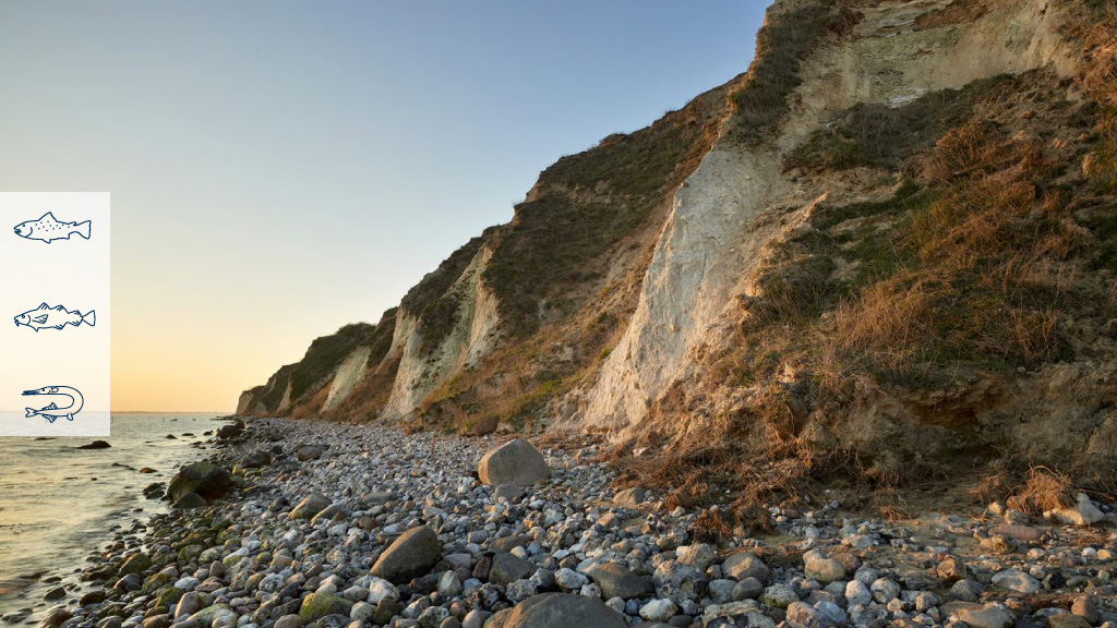 At the foot of the cliffs of Ristinge Klint the sea bed offers many rocks and plenty of seaweed. In many places deep water can be found close to shore. From the car park there is a fine stretch of coastline, offering good conditions for fishing, that runs for 3km to the north/west at the foot of the cliffs.