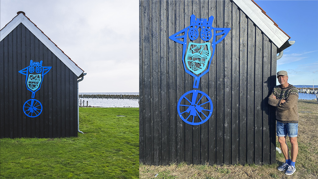 At the beginning of 2022 the organisation Destination Fyn appointed me as the artist who would create sculptural features to be seen along the "Herregårdsruten". Today a total of 10 of these sculptural reliefs can be seen on Funen, Ærø and Langeland. One in each "kommune" (Councel district). All are designerd as a bird with different symbols in its belly, that tell the story of the district they are hanging in. On Langeland the bird's belly contains, from the top: Kitesurfing/watersports, the symbol of electromagnetism - a tribute to H. C. Ørsted, the Langeland Art Towers, hathills and dolmens. In the middle the Langelands Bridge can be seen, under which is a submarine's periscope which symbolises the Langeland Cold War Museum. Below are the Wild Horses at Gulstav, a profile of Dovns Klint and finally windmills to represent Langeland being a the forefront of green energy production. In this way each sculptural relief itells the history of its Kommune and shows some of the area's geographical and cultural DNA. In my artistic approach, I aim to arose the curiosity of the viewer. Hopefully it will inspire them to explore the area further, and make detours away from the 660 km long "Herregårdsruten" cycle route.
