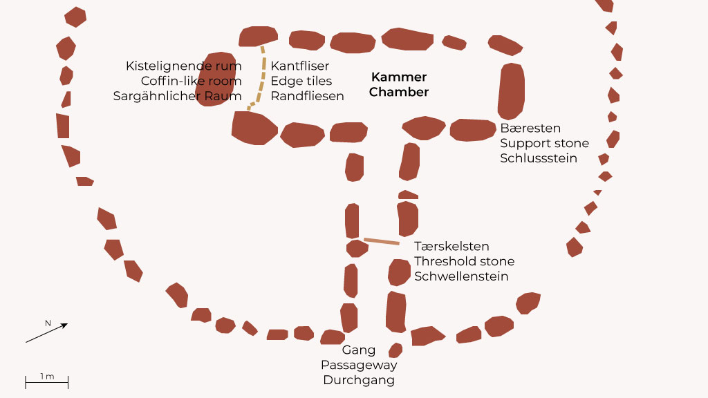 The chamber is square, 6.5 x 2 metres, with 13 support stones and a well-preserved wall. Three of the five original capstones have survived, while the rest are covered with granite beams. The floor is tiled. At the southern end there is a small coffin-like "room", the function of which is unknown.