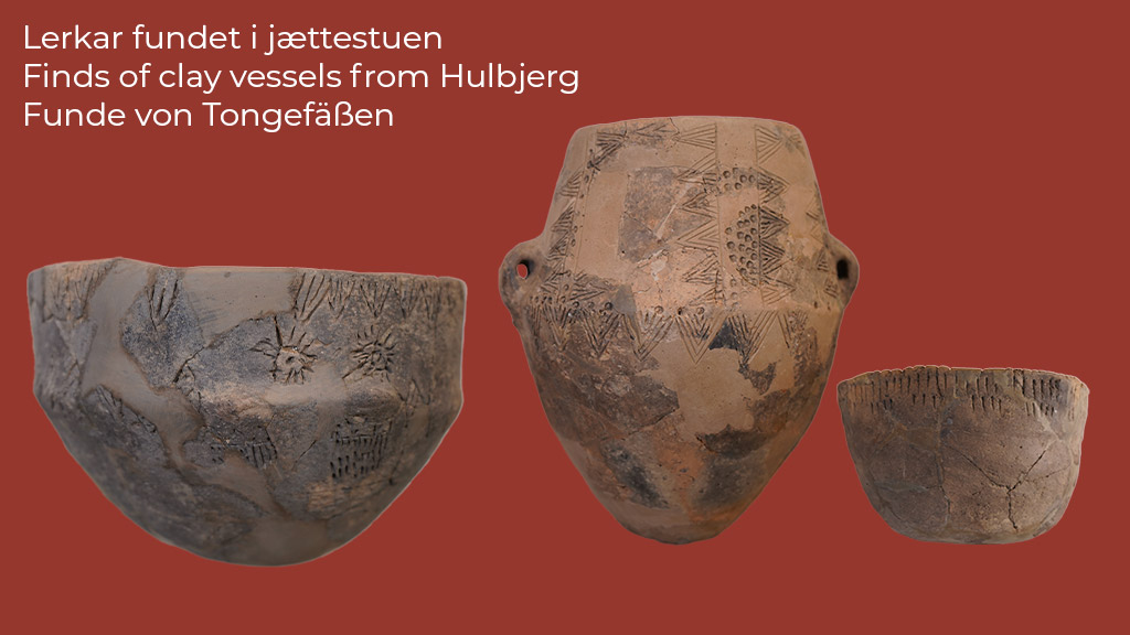 Clay vessels, weapons, arrowheads, flint tools and amber beads were found in the passageway and at the southern end of the chamber.