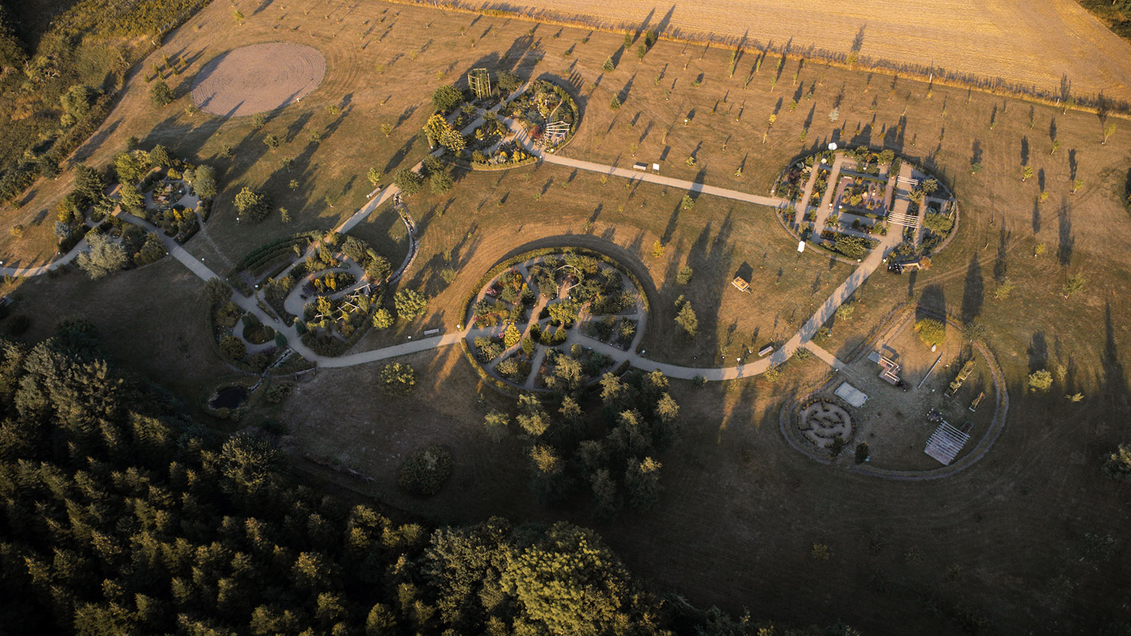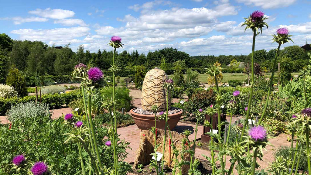 The medicine gardens consist of six round themed gardens of 800 square metres each. The gardens are located in a three to four hectare area with an arboretum with more than 100 different trees with medical significance. The first garden you come to is "Respiration and Circulation", which in addition to a lot of medicinal plants also contains a fragrance section with many beautiful fragrant roses. In "Urinary and Genital Pathways", which has a small stream running through it, you can see the very special fruit of the akebiaplant in the summer. This garden also has a small vineyard with green, blue and red grapes. In "Digestion, Metabolism and Nutrition" you can find some old - and very healthy - vegetable varieties grown with seeds from the Nordic gene bank, and there are also 10 apple trees exclusively with apple varieties from Langeland, including the Beauty from Langeland. "Infections and Hildegard's Garden" is laid out as a monastery garden with many of the plants described by the nun Hildegard von Bingen (1098 - 1179). Signs by each plant feature a translation of Hildegard's original text, and it's certainly not boring. In the centre of the Hildegard garden, there is a large tub with a wooden cone that the water quietly trickles down. The cone was made by the Funen-based company GURO. And the wood from which it was sawn comes from the forests of Tranekær Manor. In "Nervous System and Musculoskeletal System" there is a small pond with water lilies, and the garden also contains an impressive bumblebee cave. The newest themed garden was added in 2023 and has the theme The Five Senses, where you can find wild edible plants from forests, fields and beaches.