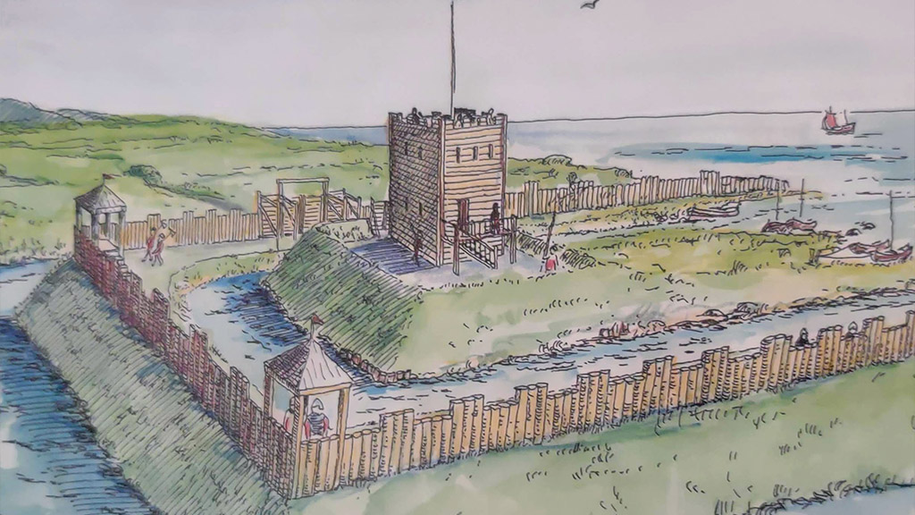 Hoborg (Hou-borg) was a fortress surrounded by two high ramparts, with water on one side and damp salt marshes and bogs to the south. At the centre of the fort was a wooden tower. Facing the sea was a so-called post barrier - a series of posts in the seabed to prevent attacks from the sea side. It is assumed that the ramparts had a relatively short but intense period of use before being abandoned and left to nature.