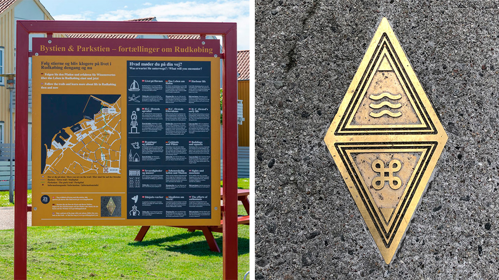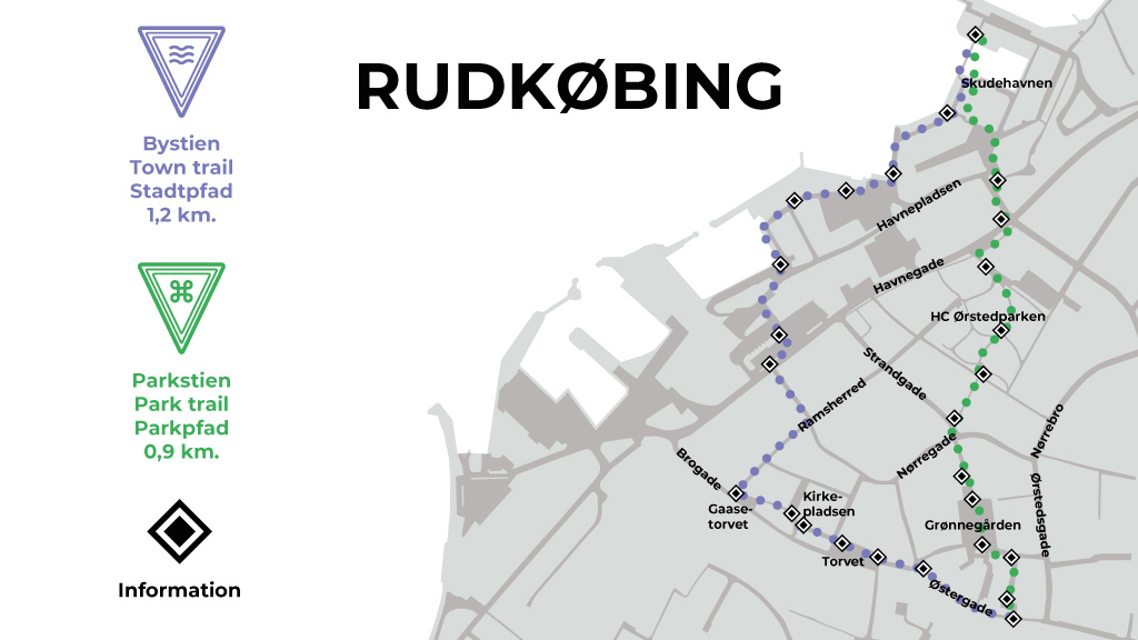 Follow the Town- and Park trails 2,1 km. and learn more about Rudkøbing then and now.
