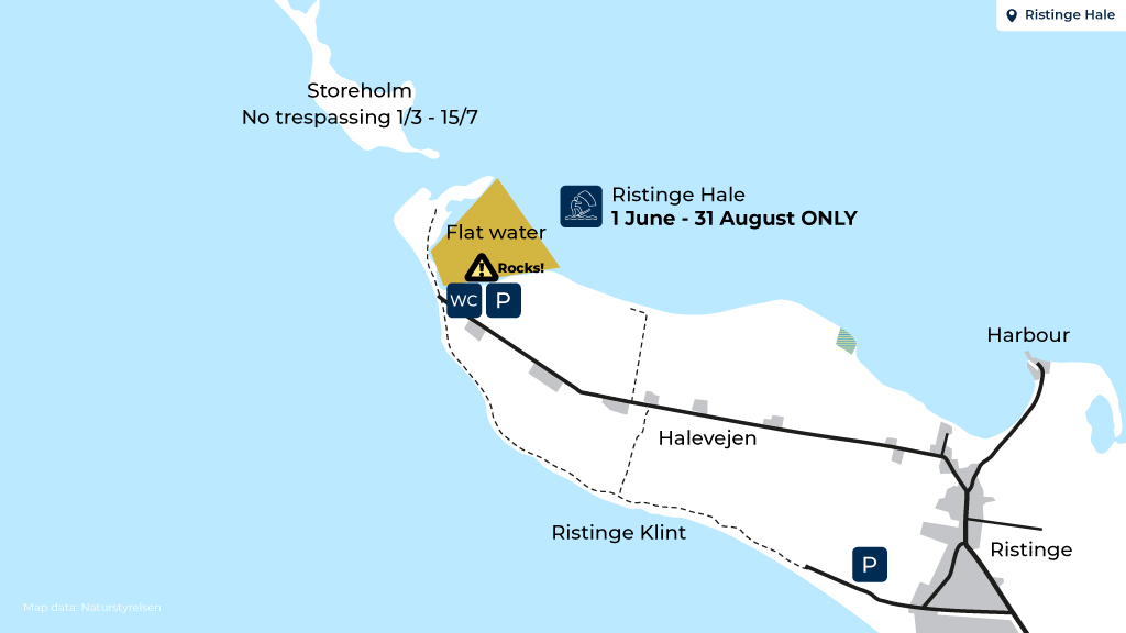 Ristinge Hale is perfect for flat water kitesurfing, but PLEASE NOTE that surfing is only allowed here from 1 June to 31 August.
