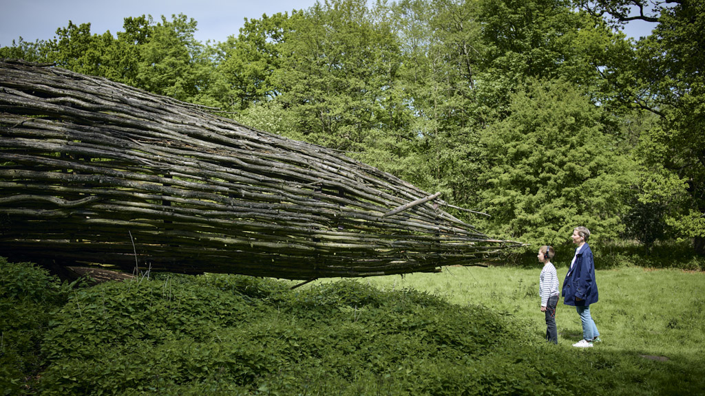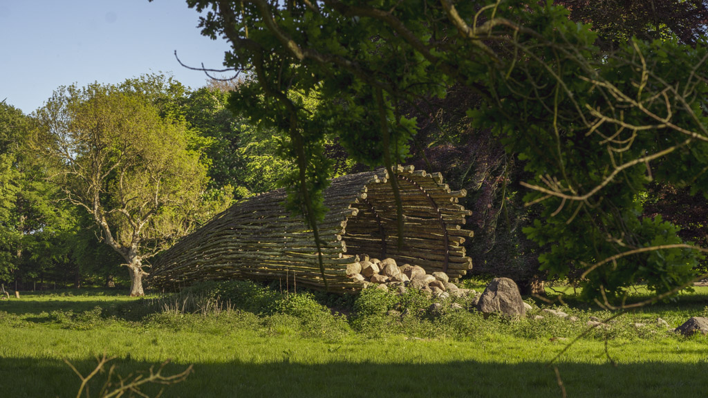 After the terrible hurricane that hit Denmark in 1999, Alfio Bonanno, the man who came up with the idea for TICKON, decided to contribute to the sculpture park himself. The result was the artwork ‘Mellem Blodbøg og Eg’ (Between the Copper Beech and Oak) which resembles a giant cornucopia, created from charred larch stems fasten to steel rings, with large boulders spilling out from its interior.