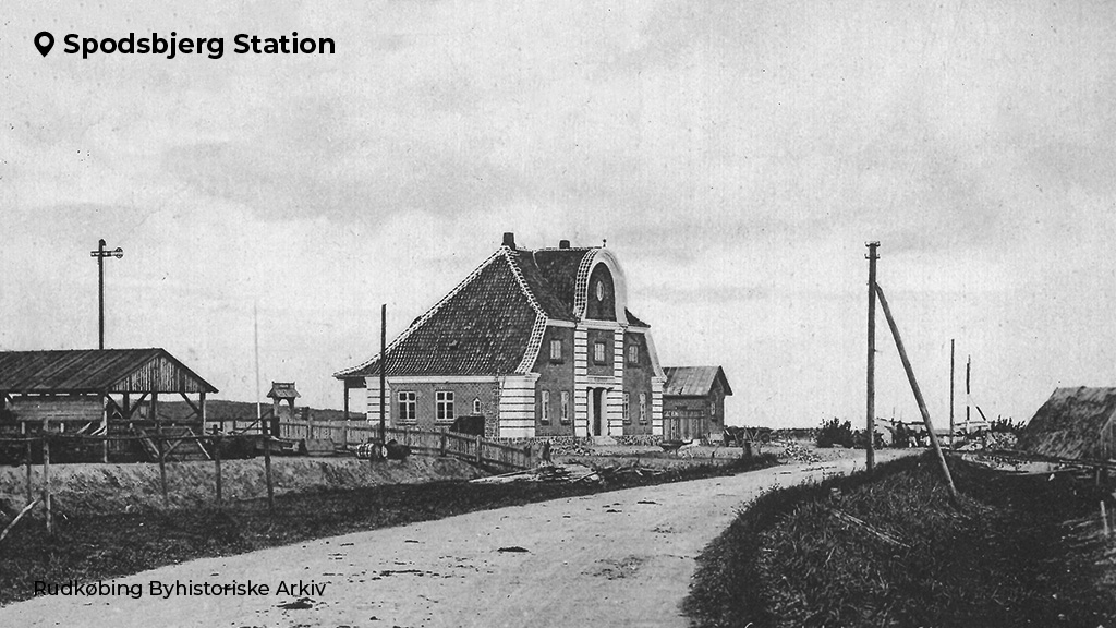 Spodsbjerg Station was built in 1911 as one of the terminus stations on the Langelands railway. Like all other buildings on the Langelands railway, Spodsbjerg Station was designed by Helge Bojsen Møller (1874-1946). The station was a transfer point for ferry travellers. In the summer, bathing trains travelled from Rudkøbing to Spodsbjerg every day. Quite often there were seven or eight carriages with bathers and the carriages were disconnected and used for changing. At the end of the day, they were then taken back to Rudkøbing.