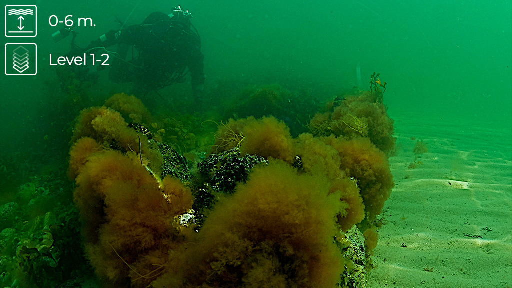 There is plenty of life in and around the wreck and the sewer pipe, as these two structures act an artificial reef in an otherwise sandy desert. Goldsinny wrasse and butterfish can be found hiding in holes and crevices, while in many places sand eels and flounders can be seen on the sandy bottom. To the great delight of the resident crabs, anglers often dispose of the remains of cod they have caught here. The surrounding areas of sea grass are always home to large numbers of fry, and together with the various species of seaweed that grown on and around the wreck, they create a haven for marine life. The shallow depth gives almost unlimited bottom time, allowing photography to find many good subjects, primarily macro-shots. However if visibility is good it is also possible to “shoot” with a wide angle lens.