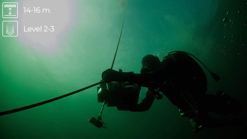 The foreparts of the ship are still standing upright, and if you excursion a little caution it is possible to swim into the ship. The cladding has fallen off, and you can see right through the wreck. The light plays beautifully through the holes, and a few large cod can often be seen standing in the front part of the wreck. The bows are the highest part of the wreck, and are still intact. They face north, and when back-lit they make an attractive, but difficult subject to photograph. The wreck is beautifully overgrown with sea squirts, mussels, sea-anemones and other invertebrates.